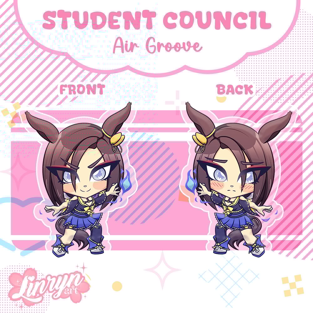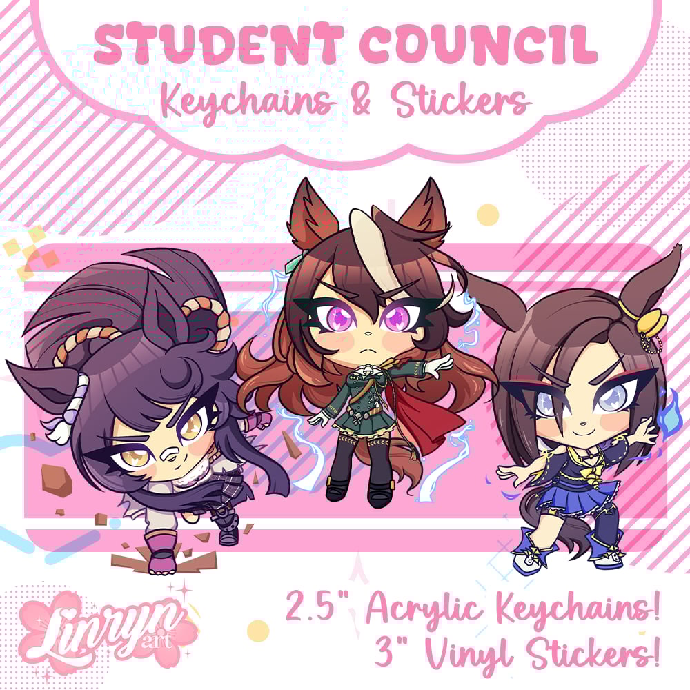 Double-sided 2.5" acrylic charms and 3" stickers, illustrated by Linryn!
